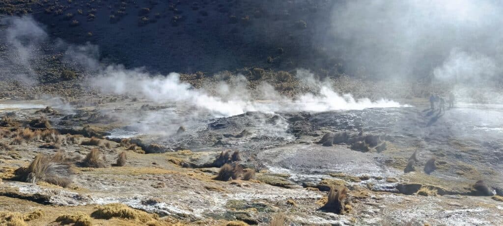 Comenzamos muy temprano para visitar los Géiseres Sol de Mañana (4.900 m.s.n.m.), un espectáculo geotérmico con fumarolas, vapor y aguas burbujeantes, especialmente impactante al amanecer.