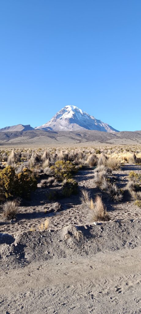 Después de esta visita, continuamos hacia el Parque Nacional Sajama, el más antiguo de Bolivia, situado a 4.200 m.s.n.m., dominado por el nevado Sajama (6.542 m), bosques de queñua, géiseres y aguas termales.