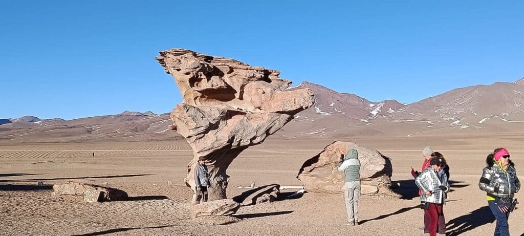 Luego recorremos la Ruta de las Joyas Altoandinas, visitando lagunas menores de colores intensos y gran presencia de flamencos: Laguna Cañapa, Laguna Hedionda, Laguna Chiar Khota y Laguna Honda. Más adelante, llegamos al Árbol de Piedra, una formación rocosa esculpida por el viento con forma de árbol petrificado, uno de los íconos del desierto de Siloli.